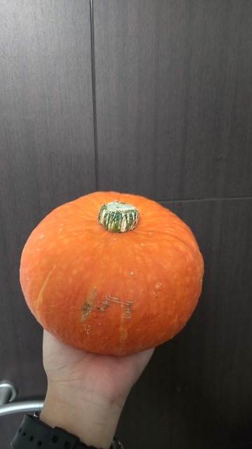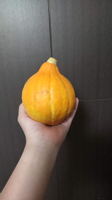 我が国では、青果用としてセイヨウカボチャ(クリカボチャ)、二ホンカボチャ、ペポカボチャが栽培され、市場に流通する。また、セイヨウカボチャとニホンカボチャの種間雑種や、クロダネカボチャがスイカやキュウリなどの苗の台木に用いられ、果実が市場流通することは、前者は「鉄かぶと」という品種*2がまれにあるものの、後者はほとんどない。また、北アメリカの先住民が栽培してきたミクスタカボチャという巨大な果実をつける品種群は、わが国での流通は全くと言っていいほどない。 セイヨウカボチャとニホンカボチャの種間雑種に、更にセイヨウカボチャを交配させた品種がある。それは「万次郎カボチャ」と呼ばれるものである。この品種はラグビーボール型の果実をつけ、果肉はニホンカボチャのしっとり感とセイヨウカボチャの甘さのいいとこどりのような風味である。しかも果実は長期保存が可能で、夏~秋に収穫すれば翌年の早春まで保存することが可能である。また、性質がかなり強健で病害虫に強く、耕作放棄地のような荒れた土地でもつるを茂らせ、また放任栽培でも大量の果実を実らせるという、かなりの優れものである。 万次郎カボチャ。池袋の百貨店で筆者撮影。 この他に、種間雑種カボチャの一種に「プッチィーニ」がある。これは、セイヨウカボチャとペポカボチャの種間雑種で、果実はよくあるカボチャ型で、表面はクリーム色でオレンジ色の縦縞が入る。しっかりとした甘みがあるので、レンジで加熱しただけでも十分美味しく食べることができる。大きさを生かして、中身をくりぬいてから食材を詰め、グラタンにしても見た目もよく味もよい。また、見た目がかわいらしいのでハロウィンカボチャとしても用いることができ、花屋でもハロウィンのシーズンに入ると「ハロウィンカボチャ」名義で売られている。ただし、食用の品種でも花屋で売られている場合は、もともと花卉として栽培されているもので、野菜と花きでは使用できる農薬の基準値が異なるから、あまり食さないほうがよい。 プッチィーニ。自宅にて撮影。 セイヨウカボチャと二ホンカボチャ、ペポカボチャは見た目の変異が大きいので果実の形状からの区別は困難だが、果梗の形状や質感の違いから区別することができる。 セイヨウカボチャ→円柱形、コルク状。果実との接合部は広がらない 二ホンカボチャ→五角形ないしは六角形、木質化。果実との接合部が広がり「座」を作る ペポカボチャ→五角形ないしは六角形、木質化果実との接合部は広がらない
