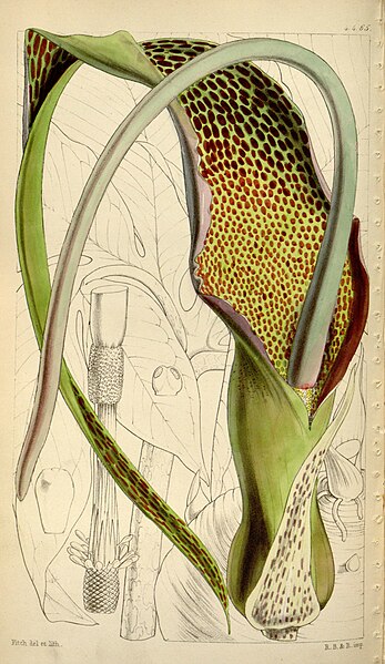 ヘビイモとは、熱帯植物の一種である。 画像出典:https://commons.wikimedia.org/wiki/File:Curtis%27s_botanical_magazine_(Tab._4465)_(8411703140).jpg 「カーティス・ボタニカル・マガジン」に記載されたSauromatum venosumの植物画。 科名:サトイモ科サウロマタム属 学名:Sauromatum venosum 原産地:インド 生態:多年草 インドやネパールの標高200m前後の場所に生え、わが国への渡来時期は不詳であるが、現在は各地の植物園の温室で栽培し観賞用にする。 草丈は80㎝から90㎝で、地下の塊茎は直径15㎝で、ごつごつとした偏球形である。一見するとコンニャクイモを思わせるような形状であるが、有毒成分を含んでおり、いかなる処理をしても有毒成分を完全に抜き去ることは難しいので、食用にはしない。 葉はコンニャクのそれに似た羽状複葉で、直径50㎝、長さ80㎝である。 葉柄には蛇を思わせるような褐色の斑点があり、和名の「ヘビイモ」はこれに由来する。葉を出すより先に緑色の花を咲かせる。花の下部は黄色くなり、内部には赤褐色の斑点がある。 花には特有の悪臭があるが、これはハエなどに受粉の仲立ちをしてもらうためである。40㎝程のひょろ長い仏炎苞を持ち、開花中は先端が下向きに垂れさがって地面につく。肉穂花序の付属物は黒みがかった紫色で、仏炎苞より短い。