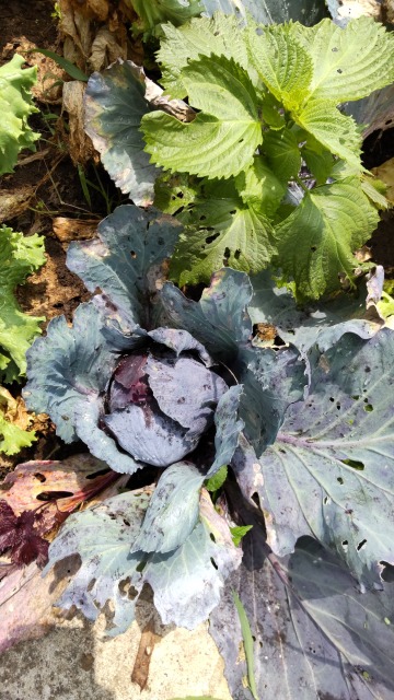 画像出典:(左)自宅近くの畑にて撮影。(右)紫キャベツ。赤塚植物園にて撮影。ぎざぎざの葉はアオジソ。