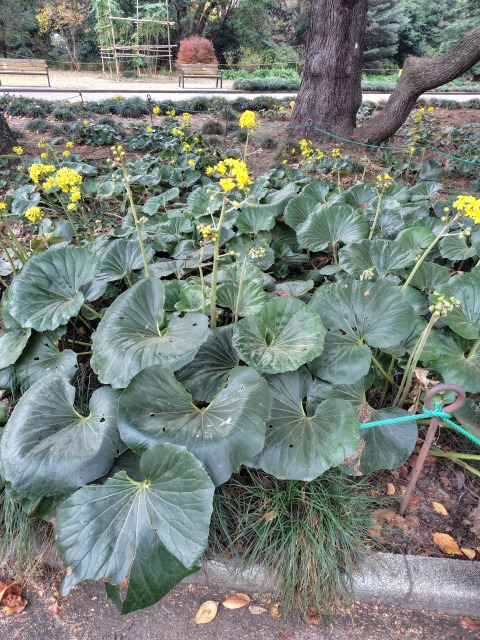 画像出典:小石川植物園にて筆者撮影 沖縄県などでの生息性が知られる。葉の縁が波打ったような見た目になり(これはツワブキが周囲の環境に適応しようとした結果、葉の形状に変化が生じたものである)、ツワブキと同じように利用できる。 また、こちらの葉の形状は変異に富み、個体によってはひし形に近い形状の葉をつけることもある。