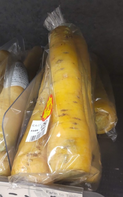 画像出典:池袋の百貨店にて筆者撮影 ニンジンの中でも根全体が黄色で、表皮のみならず内部も黄色いのが特徴である。オレンジ色の普通種に比べて甘みが強く、「カロテン臭」という特有のにおいがほとんどない。画像の品種は「金美ニンジン」という品種で、東洋系ニンジンの系統である。沖縄県には東洋系ニンジンである「地大根(チデ―クニ)」という細長い品種があり、こちらも東洋系の品種である。