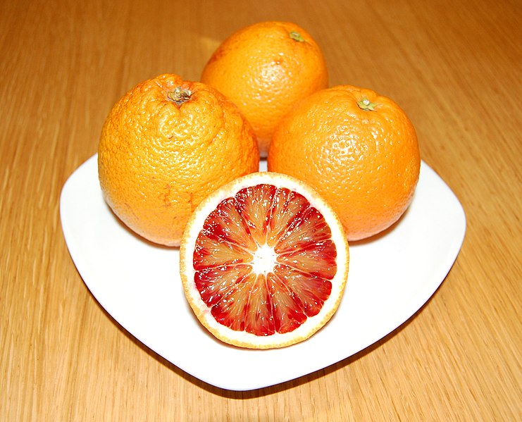 画像出典:https://commons.wikimedia.org/wiki/File:Blood_Orange.jpg 著作者:Rabensteiner(Public domain) 果肉が濃い紅色になる珍しい品種で、表皮もほかのオレンジ類に比べて赤味が強い。ブラッドは英語で「血」の実で、果肉や果汁が鮮血のように赤いことからこの名称で呼ばれる。これは、赤色色素のアントシアニンを大量に含んでいるからである。 古くはヨーロッパの主要な栽培品種であったが、現在はバレンシアオレンジに生産量を抜かれている。 現在は果汁をジュースにしたものが販売されているほか、少数ながら生の国産品も出回っている。