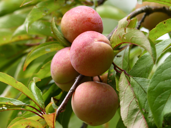 スモモとは、果樹の一種である。 画像出典:いずれもhttps://www.botanic.jp/plants-sa/sumomo.htm 「ボタニックガーデン」の「すもも」のページから。 科名:バラ科スモモ属 学名:Prunus salicina 原産地:中国 生態:落葉高木 中国が原産の落葉高木で、樹高は10mになり、4月に葉の付け根に白い花を咲かせる。花はアンズとよく似ているが、アンズとは異なり、蕚片は反り返らない。6月から9月にかけて球形の果実を実らせ、緑色から赤色ないしは紫色、黄色に熟す。熟した果実は、表面に蝋質の粉を吹くのが特徴である。この粉が多いほど、果実は新鮮でよく熟しているのである。この粉の正体は「果糖」と呼ばれるもので、果物ではブルーベリーやブドウ、リンゴにみられ、野菜ではスイカやカボチャの表面にみられることがある。 現在我が国で流通するのは本種(二ホンスモモ)とセイヨウスモモで、本種は古くは記紀に記載があるが、大規模な栽培が始まったのは江戸時代以降である。明治ごろに日本で古くから栽培されていた品種がアメリカに導入され、アメリカ系スモモと交雑したものが再び日本に里帰りした品種が多く栽培されている。果実はもっぱら生食される。薬用植物としての効果もあり、果実に含まれるクエン酸やカリウム・リンゴ酸により利尿作用・高血圧予防・肝機能を高める効果がある。