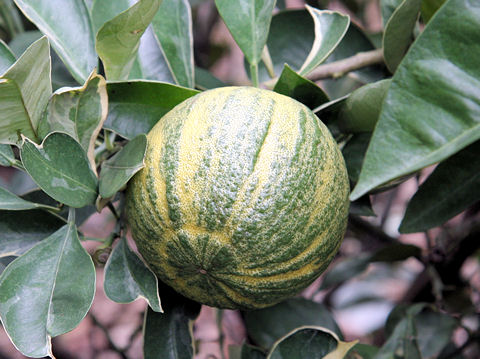 画像出典:https://www.botanic.jp/plants-ta/daidai.htm ダイダイの園芸品種で、葉には黄色い斑が入り、果実には緑色の模様が入る。「地球柑」の名称は、この見た目に由来する。「地球柑」は園芸名で、植物学上は「シマダイダイ」(縞橙)の名称で呼ばれる。 普通観賞用として庭に植えられるが、果汁を酢の代わりに利用することができる。
