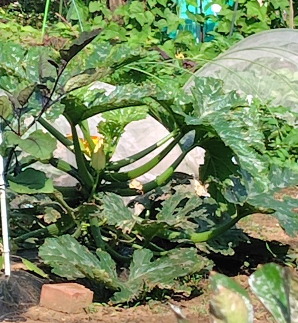 ズッキーニ(西葫蘆)は、西洋野菜の一種である。 画像出典:自宅近くの畑で筆者撮影 画像出典:筆者撮影。「UFOズッキーニ」という品種である。「スキャロープ」(名称は英語で「ホタテ貝」の意味)や「アラジン」、「パティパン」という名称でも呼ばれる。味は普通のズッキーニと変わらない。大きく成長したものは観賞用にする。色合いは多彩で、濃い緑色のもの、黄色と緑のツートンカラーになるもの、純白になるもの、オレンジ色のものなどがある。 画像出典:筆者撮影。果皮が縞模様になる珍しい品種である。この縞模様部分が盛り上がり、切り口が多角形になる「ロマネスコズッキーニ」という品種も知られる。風味は緑色のものと変わらない。 画像出典:筆者撮影。丸ズッキーニ。ますますキュウリやナスの仲間ではなくカボチャの仲間であることを思い出させてくれるような形状である。 科名:ウリ科カボチャ属 原産地:北アメリカ大陸 学名:Cucurbita pepo var.melopepo 生態:一年草 北アメリカが原産の一年草で、ペポカボチャの一種である。ヨーロッパには植民活動により16世紀ごろにアメリカから持ち込まれ、特に南フランスからイタリアにかけて普及し、その後逆輸入の形でアメリカにも広まった。わが国には昭和時代末期に欧米から輸入され、1980年代初頭にはわが国で栽培されるようになった、比較的ニューフェイスの野菜である。 蔓性の一年草だが、蔓があまり伸びず、親づるの上に果実がつく。このため、「ツルナシカボチャ」の和名がある。葉は大きな掌型で、周囲に鋸歯があり、表面には白い模様が入り、葉柄は長い。この白い模様はよく病気と誤解されるが、これはもともと持っている性質で、ウリ科植物がよく罹患するうどん粉病の病状とは大きく異なる。うどん粉病は葉の表面が白く灰をばらまいたようになり、触れるとカビの胞子が指に付着する。 近縁種のカボチャのように蔓が四方に伸びることはなく、株全体が横へはう性質をもち、花茎を伸ばして黄色い花を咲かせる。 花を咲かせてから開花後3日から5日後のキュウリのような形状の未熟な果実を野菜として食用にする。この利用法からかつては「ウリカボチャ」という和名が付されたこともあるようだが、今ではこの名称はほぼ用いられなくなっている。これ以上日にちを置くと、果皮はのこぎりでないと割ることが難しいほどカチカチに硬くなり、果肉は繊維質が発達して味が悪くなって食用には向かなくなる。果実の形状は前述のようにキュウリ型や丸形、円盤型や洋ナシ形、果皮が黄色くて表面がコブで密に覆われる鶴首型(Crookneck squash)など多彩である。ひょろ長い黄緑色の鶴首型の果菜が「トランペットズッキーニ」という名称で呼ばれることがあるが、これはニホンカボチャの鶴首系の品種の果実を若どりしたものである。果実の色も、黒緑色や黄色、黄緑色や白色がある。近年は黄色と黄緑色のツートンカラーの品種もある。 若い果実を食用とするため、水分に富む。ナスに似た風味があり、揚げ物や煮物、焼き物に適する。イタリアのカポナータやフランスのラタトウィユなどは有名である。 花や蕾も「花ズッキーニ」の愛称で呼ばれ食用にされる。花の部分に食材を詰めて揚げるフリッターのような食べ方が向いている。ズッキーニを含めたカボチャ類の花はこのように食用にすることができる。 画像出典:筆者撮影。「花ズッキーニ」。東京都練馬区光が丘の八百屋にて筆者撮影。