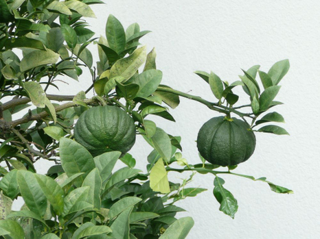 画像出典:(左1)と(右2)は自宅にて筆者撮影。(右1)(左2)は東京都薬用植物園にて撮影。(左1)臭橙(カブス)。(右1)臭橙の若い果実をつけた木。(左2)臭橙の熟果。(右2)座代々(ザダイダイ)。 科名:ミカン科ミカン属 学名:Citrus aurantium 原産地:中国 生態:常緑小高木 中国南部が原産で、わが国には大和時代に中国から渡来し、中間地や暖地に栽植される常緑小高木。樹高は3mほどで、枝に棘がある。葉は互生し、葉は厚く卵型で、初夏に五芒星型の花を咲かせ、芳香がある。果実は直径6㎝ほどで、最初は鮮やかな緑色で、熟すと橙黄色に変色する。樹に残しておけば、翌年の夏に再び緑色に戻る。このため「回青橙(かいせいとう)」とも呼ばれる。果梗に近い部分がやや盛り上がる「ザダイダイ」というものもある(写真右下)。 果実は酸味が強く、苦みがあるので生食できないが、果汁をポン酢として料理の味付けに用いる。また、正月の鏡餅の上にのせる柑橘は、本来はダイダイだが、温州ミカンや紀州ミカンで代用されることもある。 和名は果実が翌年の夏も残って緑色に再び戻ることを「代々栄える」ことにつなげた。果皮は「橙皮(とうひ)」として漢方薬に用いられる。「カブス」という名称は、ダイダイのうち、写真左上のように果梗に近い部分が平坦になるものをいう。「臭橙」という漢字を当てる。