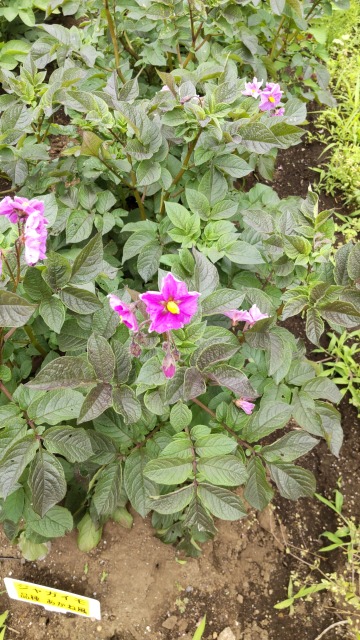 (左)「あかね風」という品種で、芋の表皮が赤っぽい珍しい品種。(右)品種名のラベルがなく不詳。花弁が反り返っている点は、野生品の特色が色濃く出ている感がある。いずれも東京都薬用植物園にて筆者撮影。