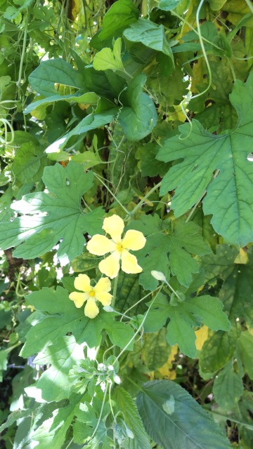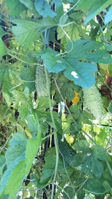 ツルレイシは、果実を野菜として食用にするために栽培される植物の一つである。 画像出典:花と果実のいずれも東京薬科大学薬用植物園にて撮影。