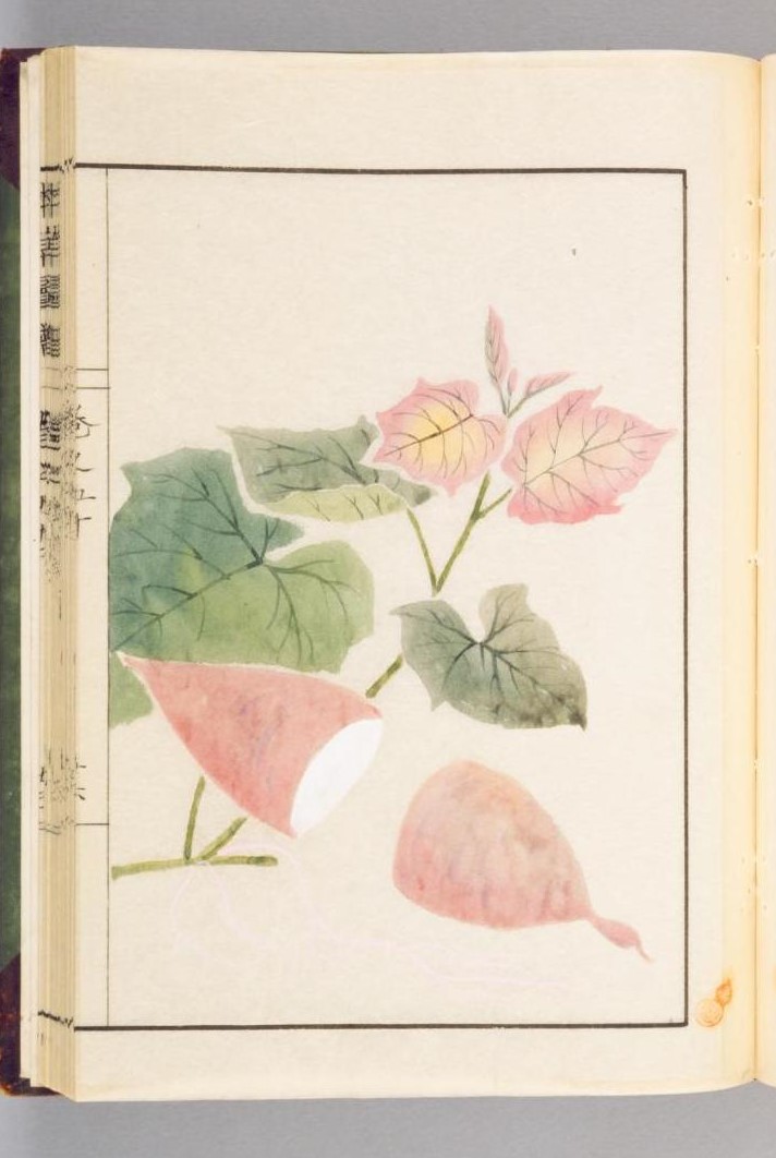 サツマイモは、根茎と食用とする栽培植物の一種である。 画像出典:(上・中)https://botanic.jp/plants-sa/satuma.htm(下)岩崎常正<岩崎潅園>//著『本草図譜』第7冊 巻50菜部柔滑類3,刊写入交. 国立国会図書館デジタルコレクション https://dl.ndl.go.jp/pid/1287161