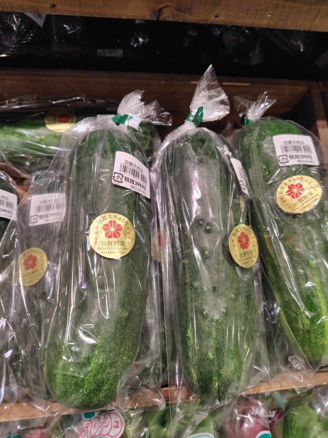 画像出典:池袋の百貨店にて筆者撮影 石川県の伝統野菜の一つである。昭和11年、金沢市久安町の篤農家・米林利雄氏が、仲買人から東北産の白いぼ系統の太い果実をつけるキュウリの種子を譲り受け、住宅近隣の農家7人に分けて栽培したのが始まりであるとされる。もともとは黄色で、断面が不規則な三角形であったようだが、栽培を重ねるにつれ果皮色は濃い緑色になり、断面も三角形から円柱に変化したという。 普通キュウリというと、表皮は残すかまばらに剥く。しかし本種の表皮は苦くて食用に適さないので、完全に剥いてしまう。そうして、トウガンのように煮て食べるのである。もちろん、普通のキュウリのように塩もみしたうえでサラダや冷やし中華の具材にすることもできる。