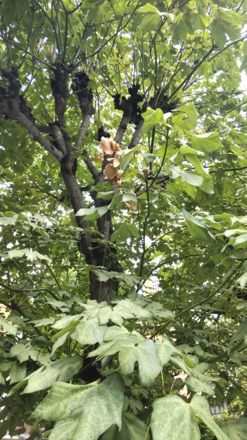 画像出典:(左)東京都文京区にて筆者撮影/(右)東京都千代田区四谷にて筆者撮影 科名:アオイ科(旧アオギリ科)アオギリ属 学名:Firmiana platanifolia 原産地:中国、インドシナ、台湾 生態:落葉高木 中国や台湾などの亜熱帯地方が原産の落葉高木で、わが国への正式な渡来時期は特定することが難しいのだが『風土記』や『万葉集』にはみられることから、そのころにはすでに我が国にあったと考えられる。樹高は15mほどになり、樹皮は滑らかで鶯色~鮮やかな緑色である。葉は浅く掌状に三つ~五つに分裂し、枝先近くに互生する。 初夏から夏の盛りにかけて、大きな円錐花序をつけ、小さな黄白色の花を咲かせる。雄花と雌花が入り混じるように咲くのが特徴である。果実はいわゆる袋果で、枝から下垂し、熟すと割れて真球形の種子を露出する。 葉・果実・幹・枝・樹皮は古くから薬として利用され、止血や打撲、切り傷、咳、疣、やけど・抜け毛、母乳の分泌の促進のために用いられてきた。また、種子は食用にすることができ、太平洋戦争中にコーヒーの種子が手に入りにくくなった際にはコーヒー豆の代理品として用いられたようである。 和名は前述のように樹勢がキリに似ており、また樹皮が緑色であることから。 よく水を吸い上げて、火に強い性質がある。生命力が強く、潮水や潮風などの塩害や、大気汚染にもよく耐える。広島県には「被爆アオギリ」という個体が知られている。これは1945年8月6日の原子爆弾の投下により、爆心地から1.3kmの地点で被爆して半身が焼け焦げ、生命活動が止まったかに見えたが、翌年の春に再び芽を出したことから、平和を願う生命力のシンボルとして有名になった。