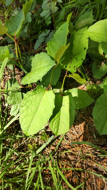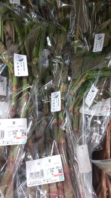 イタドリ(虎杖)とは、山菜の一種である。 画像出典:西武百貨店池袋店にて筆者撮影 科名:タデ科イタドリ属 学名:Reynoutria japonica 原産地:東アジア 生態:多年草 我が国、特に西日本をはじめ朝鮮半島や台湾に分布する多年草草本植物で、山野に多く生息し、草丈は0.5m~1mほどに達する。夏から秋に枝先に複総状花序をつけ、小さな白い花を咲かせる。 早春から初夏にかけて地下に横に這うようにして伸びた根からタケノコ状の新芽を出し、この新芽を山菜として古くから食用にしてきた。酸味があるが、これは植物体にシュウ酸が含まれることに起因するので、食する際にはよくゆでて水けを斬ってからあえ物などに供するのである。 根は「虎杖根(コジョウコン)」の名称で関節痛を和らげるのに用いられる。 近縁種のオオイタドリ(Reynoutria sachalinensis)は草姿はよく似ているが、全体的に大ぶりで、特に葉が大きく、現在は関東をはじめとした東日本地域に帰化植物として繁茂している。こちらも葉を食用にすることができるほか、根は緩下剤や蕁麻疹、気管支炎などに効能のある薬として用いる。 画像出典:オオイタドリ。筆者が東京都千代田区四谷にて撮影。