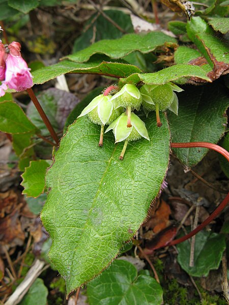 イワナシとは、高山植物の一種である。 画像出典:https://commons.wikimedia.org/wiki/File:Epigaea_asiatica_2.JPG 科名:ツツジ科イワナシ属 学名:Epigaea asiatica 原産地:日本 生態:落葉小低木 北海道南部から本州の、主に日本海側の山地の樹林化に生息する落葉小低木である。 茎は枝分かれして地を這うようにして伸び、長挟10㎝~30㎝、若い枝には褐色の長い毛がある。 葉は長さ4㎝~10㎝で、春から初夏に薄い桃色の花を咲かせ、枝先に長さ1㎝~2㎝ほどの花序に花が数個付き、花冠の長さは1㎝ほどである。 果実は夏に熟し、蒴果だが胎座が厚く、汁気を多く含んで液果状になり、甘みがあって食用にすることができる。風味は梨に似ており、これが和名の由来となっている。