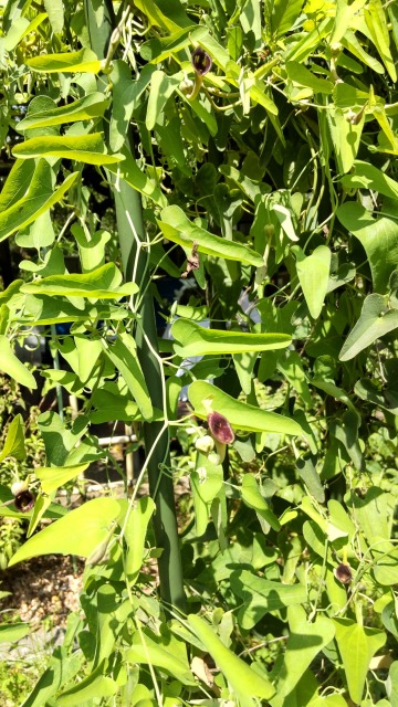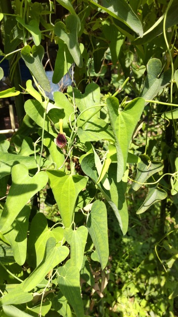 画像出典:小石川植物園にて撮影。 科名:ウマノスズクサ科ウマノスズクサ属 学名:Aristolochia debilis 原産地:東アジア 生態:つる性多年草 我が国や中国が原産のつる性の多年草であるが、冬になると地上部は枯れ、土中の塊根で冬を越す。川の土手や畑、林縁に生える。植物体は全体的に毛はなく、精油が含まれているので人によっては不快感を覚えるような特有のにおいがある。 草丈は1mから5mで、他のものに絡みつくように成長する。葉は縦長の心臓型で、両側が人の耳のように出っ張ったようになり、茎に互生する。6月から9月にかけて葉腋に、基部が膨らんだような形状のパイプ型の花を咲かせ、花には花弁がなく、花弁のように見える広がった口のような部分は筒の一部が変化したもので、紫色ないしはあずき色になる。 かつては「馬兜鈴(バトウレイ)」の名称で薬として利用され、解熱、去痰、咳止め、気管支拡張や肛門の薬として利用されたが、本種は全体にアリストロキア酸という有毒成分を含み、多量に摂取すると腎障害を引き起こす。この中毒事故が多数報告されているので、現在は薬用植物としてよりは、山野草や有毒植物として知られる。