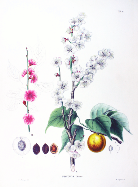 ウメ(梅)は、果樹ならびに花を観賞用にする樹木の一種である。 画像出典:https://commons.wikimedia.org/wiki/File:Prunus_mume_SZ11.png?uselang=ja シーボルト「日本植物誌」より抜粋 科名:バラ科サクラ属 学名:Prunus mume 原産地:中国 生態:落葉高木 中国が原産の落葉高木で、わが国には弥生時代に入ってきたと思われ、当時の遺跡から種子が出土している例が散見される。今日では庭木としてわが国の各地で栽培されているが、九州の大分県や宮崎県の一部には、野生化した個体がみられるという。 樹高は6mに達し、多く枝分かれし、若い枝には毛がかすかにあるかあるいはほぼない。葉は互生し、葉の大きさは5㎝~8㎝で、卵型で周囲に細かな鋸歯がみられる。1月から3月にかけて、葉の出現に先立って前年枝の葉腋に芳香のある5枚の花弁からなる花を咲かせる。花は白色や鮮やかな赤味の強いピンク色があり、品種は「豊後」(後述)や「白加賀」「南高」「紅サシ」など様々で、300種を優に超える。果実は球形で、縦に1筋の溝があり、当初は緑色だが、梅雨ごろに黄色く熟し、木から落ちて芳香を放つ。青梅はアミグダリンという生産配糖体を含んでいるので、生食すると腹痛や嘔吐などの症状を引き起こす。それゆえ、シソや塩につけこんで梅干にするほか、酒に漬けて梅酒にする。果実を黒くなるまでいぶしたものは「烏梅(うばい)」という名称で漢方薬として知られ、健胃、整腸、消炎、細菌性腸炎、腸内異常発酵、駆虫、止血、強心作用がある。