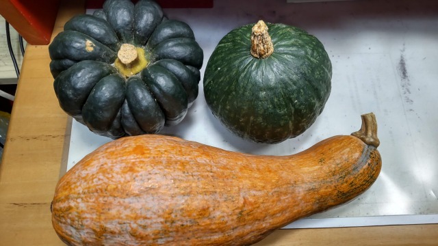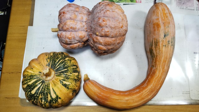 (左)バターナッツ。煮物には向かないが、グリルやポタージュに向く。見た目が面白いので、観賞用にされることもある。自宅にて筆者撮影。果実はそれほど大きくないので家庭菜園に向く。(右)小菊。自宅にて筆者撮影。菊座型で、果実が小さいのが特徴。煮物にしてもよいが、中身をくりぬいて食材を詰め、蒸してもよい。