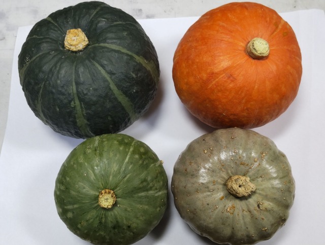 画像出典:筆者撮影。左の品種は「黒皮」。菊座型のいわゆる「ボウブラ」。右の写真のうち、ごつごつした瓢箪型のものは「鹿ケ谷」(いわゆる「トウナス」)、ヒシャク状のものは「鶴首」、「鶴首」の隣の、模様入りの菊座型の品種は「砂糖縞」という品種である(農業生物資源ジーンバンクより)。 古くは単に「カボチャ」と言えば本種を指した。我が国にはカボチャ類の中で最も早い時期に伝来しており、渡来時期は桃山時代初期とされ、ポルトガル人が豊後府内に漂着した際、領主・大友義鎮に献上したという逸話がある。日本では当初観賞用であった。 当時医学界の権威書であった「本草綱目」に本種と思われるカボチャの図が収録されているが「有毒である」と記されており、なかなか食用としては利用されなかったのである。一応、桃山後期にはカボチャが有毒であるという情報は改められており、長崎では現地在住の中国人に卸すため栽培されていたという記録があるものの、現地の日本人が食していたかどうかは不明である。しかし、江戸時代前期の元禄10年(1697年)になると、農学者・宮崎安貞によって「農業全書」が出版され、その書物にはすでにカボチャが登場しており、さらに同時期に本草学者・貝原益軒による生物百科事典「大和本草」にもカボチャに関する紹介がみられることから、このころにはすでにカボチャ(二ホンカボチャ)が人口に膾炙する食材になっていたことは想像に難くない。 果実はゴツゴツして皺や襞のあるものが多く、会津、菊座、縮緬、鶴首、鹿ヶ谷など地方の様々な品種があり、江戸時代には菊座型のものはボウブラと呼ばれ、ひょうたん型の品種、特に鹿ヶ谷の系統はカボチャないしはトウナスと呼ばれたが、現在はこのような区別はほとんどなくなっている。葉は少し切れ込みのある心臓型で、果梗は5角形で、木質化し、果実に接する部分[いわゆる「座」)が広がる。品種によっては葉に白い斑紋が入るが、これは特性であって病気ではない。ただし、葉が粉を吹いたように真っ白になっていれば、それは十中八九うどん粉病にかかっている。 セイヨウカボチャに比べて甘みは弱く、出汁をよく吸うため和食には欠かせないのだが、えびす南瓜やみやこ南瓜などの甘みが強いF1品種のセイヨウカボチャの台頭により古くからの在来種の多くが姿を消し、それに伴って生産量が激減し、現在は百貨店や料亭に卸すくらいの量しか栽培されなくなった。 果皮の多くは当初は黒に近い緑色だが、熟すと柿色ないしは黄褐色になり、甘みもやや増す。種子はセイヨウカボチャよりは薄い。 現在はニホンカボチャの中でも甘みが強いアメリカ産の「バターナッツ」(果形はひょうたん型で、表皮はベージュ色ですべすべしている。カボチャ類の中でも耐暑性が強い部類である)という品種の人気が高まっており、昨今の地産地消ブームも相まって、ニホンカボチャの真価が見直されつつある。 本種の性質は大まかに4つに分けることができる。 【菊座郡】 果実の形状は扁球形で、果実の表面にコブがほとんどない品種で、縦溝が鮮明な品種群。品種によっては斑紋を生じることがある。代表的な品種に黒皮、白皮砂糖、会津小菊、三毛門など。フランスで栽培される「マスキード・プロヴァンス(Musquee de Provance)」という品種は本種とよく似た形状で、巨大な果実をつける。果実が極端に大きくなる品種は味が薄いことが多いが、この「マスキード・プロヴァンス」の風味は非常に優れている。 【縮緬郡】 果実の形状は扁球形で、果実の表面に細かなコブを生じ、縦溝がほとんどはっきりしていない品種である。代表的な品種に、干潟、愛知縮緬、備前縮緬黒皮、見附、田尻など。 【トウナス郡】 果実の形状は瓢箪型で、果実の表面に細かなコブを生じるか、縦溝が鮮明に走る。斑紋はない。代表的な品種は、鹿ケ谷。 【鶴首郡】 果実の形状はトウナス郡とよく似ているが、果形はヘチマに似ることもあり、果実の表面はつるりとしていて、特有の斑紋がある。おそらくは中国で発展し、日本に導入された品種群であろう。福岡県や愛知県で栽培されてきた。代表的な品種に、鶴首、江南長。果実の色は最初は黒に近い緑色だが、熟すと黄色に近い褐色になる。右写真のように、果実にうっすらと黄色い模様が入ることがある。果形がベージュ色のアメリカの品種「バターナッツ」や沖縄の「島カボチャ」も本種とよく似ている。