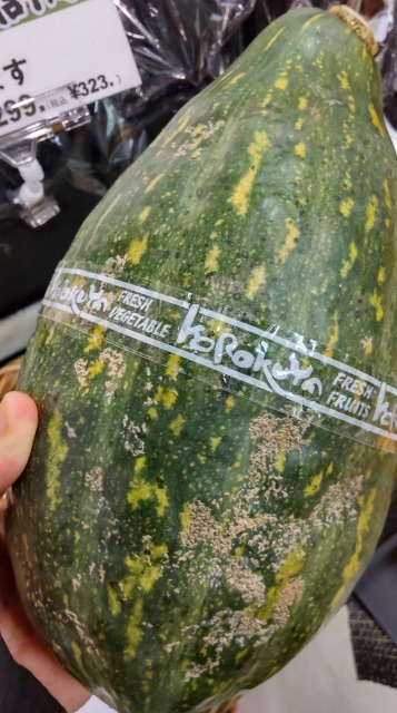 我が国では、青果用としてセイヨウカボチャ(クリカボチャ)、二ホンカボチャ、ペポカボチャが栽培され、市場に流通する。また、セイヨウカボチャとニホンカボチャの種間雑種や、クロダネカボチャがスイカやキュウリなどの苗の台木に用いられ、果実が市場流通することは、前者は「鉄かぶと」という品種*2がまれにあるものの、後者はほとんどない。また、北アメリカの先住民が栽培してきたミクスタカボチャという巨大な果実をつける品種群は、わが国での流通は全くと言っていいほどない。 セイヨウカボチャとニホンカボチャの種間雑種に、更にセイヨウカボチャを交配させた品種がある。それは「万次郎カボチャ」と呼ばれるものである。この品種はラグビーボール型の果実をつけ、果肉はニホンカボチャのしっとり感とセイヨウカボチャの甘さのいいとこどりのような風味である。しかも果実は長期保存が可能で、夏~秋に収穫すれば翌年の早春まで保存することが可能である。また、性質がかなり強健で病害虫に強く、耕作放棄地のような荒れた土地でもつるを茂らせ、また放任栽培でも大量の果実を実らせるという、かなりの優れものである。 万次郎カボチャ。池袋の百貨店で筆者撮影。 この他に、種間雑種カボチャの一種に「プッチィーニ」がある。これは、セイヨウカボチャとペポカボチャの種間雑種で、果実はよくあるカボチャ型で、表面はクリーム色でオレンジ色の縦縞が入る。しっかりとした甘みがあるので、レンジで加熱しただけでも十分美味しく食べることができる。大きさを生かして、中身をくりぬいてから食材を詰め、グラタンにしても見た目もよく味もよい。また、見た目がかわいらしいのでハロウィンカボチャとしても用いることができ、花屋でもハロウィンのシーズンに入ると「ハロウィンカボチャ」名義で売られている。ただし、食用の品種でも花屋で売られている場合は、もともと花卉として栽培されているもので、野菜と花きでは使用できる農薬の基準値が異なるから、あまり食さないほうがよい。 プッチィーニ。自宅にて撮影。 セイヨウカボチャと二ホンカボチャ、ペポカボチャは見た目の変異が大きいので果実の形状からの区別は困難だが、果梗の形状や質感の違いから区別することができる。 セイヨウカボチャ→円柱形、コルク状。果実との接合部は広がらない 二ホンカボチャ→五角形ないしは六角形、木質化。果実との接合部が広がり「座」を作る ペポカボチャ→五角形ないしは六角形、木質化果実との接合部は広がらない