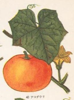 画像出典:筆者が自宅にて撮影。左のウリ型の品種はDelicata(「スイートポテト南瓜」とも呼ばれる)、右上のオレンジ色の品種はJack be little(生育環境によるものか、緑色の模様ができている)、右下の白色と緑色の縞模様の菊座型の品種は錦甘露。いずれも観賞用はもちろん、サツマイモを思わせるような甘みがあって、食用にすることができる。右:「キントウガ」。筆者の蔵書「原色図説植物大辞典」(1938年)より抜粋。 我が国には明治時代に渡来したとされる。草姿は二ホンカボチャに似るが、果梗は多角形で、末端がやや太くなる程度で、果実との接合部は膨らまない。 様々な変種があり、果実の形状や色合いも千差万別である。特に、様々な形状や色合いに富んだ小型の果実をつける品種は「カザリカボチャ」「オモチャカボチャ」「オーナメンタル・ゴード」(ornamental gourd)と呼ばれる。この品種群は果皮が固くて包丁では切ることが難しく、果肉も繊維質で味が悪いのでもっぱら観賞用にされる。 食用にされるものとしては花が咲いてから一週間弱の若い果実を食用にするズッキーニや、加熱すると果肉が繊維状にほぐれるキンシウリ(そうめんカボチャ)、湯呑ほどの大きさで菊座カボチャに似た形状の「錦甘露(にしきかんろ)」(英名はSweet Dumpling)などがある。ズッキーニやキンシウリについてはそれぞれ別の項で述べる。 「本草図譜」や「有用植物図説」などの江戸時代や明治時代の植物図譜に「金冬瓜(キントウガ)」「阿古陀瓜(アコダウリ)」というオレンジ色の果実のウリ科植物が見られるが、植物学者の牧野富太郎によれば、これはペポカボチャの一種に相当するという。牧野著書「牧野日本植物図鑑」にも金冬瓜の解説が図とともに紹介されている。また、1608年に豊臣秀頼により建築された京都北野天満宮の拝殿の蟇股部分に金冬瓜の彫り物がみられるという。 現在はいずれもほとんど見かけないが、古い植物図譜から果実の形状が確認できる。金冬瓜がウリ型で長い形状であるのに対し、阿古陀瓜は球形。兜やぼんぼりの中でカボチャのような形状が「阿古陀」と呼ばれるのは、この阿古陀瓜が由来とされる。ただし、室町時代前期に詠まれた阿古陀瓜についての詩があり、室町時代前期にはまだカボチャは日本に導入されていないので、阿古陀瓜をカボチャ属とは別のウリ科の植物として見る向きもある。 なお、かの有名な名探偵・シャーロックホームズの趣味の一つに家庭菜園があり、その中では「ナタウリ」という野菜が育てられている。これはペポカボチャの一種で、Marrowという英名がある。果実はズッキーニを大きくしたような、巨大な冬瓜と見まがうほどの見た目をしており、スイカのような縞模様が出ることもある。ズッキーニと同じく開花から一週間以内の若い果実か、ズッキーニより少し熟した程度の果実を食用にする。表皮が硬くなるまで育てて、観賞用にすることもある。果皮は鉈でないと割ることが難しいほど固くなるため、「ナタウリ」の和名がある。 画像出典:村越三千男 編・画『内外植物原色大圖鑑』第1卷(合辨花),誠文堂新光社,1939.12. 国立国会図書館デジタルコレクション https://dl.ndl.go.jp/pid/1900775 阿古陀瓜の画像。金冬瓜とよく似ているが、果実の形状が丸いので区別できる。