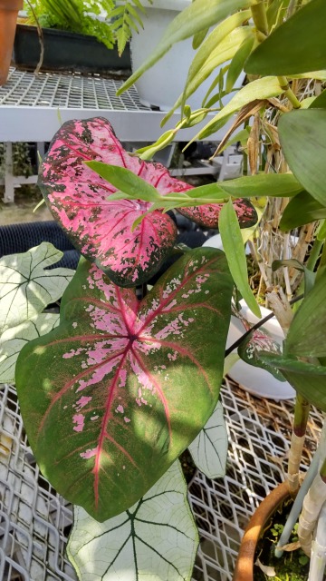 カラジューム(Caladium)とは、観葉植物の一種である。 画像出典:小石川植物園にて筆者撮影 科名:サトイモ科ニシキイモ属 学名:Caladium bicolor 原産地:南米 生態:多年草 南米の熱帯地域が原産の多年生草本植物で、わが国には明治時代中期に渡来し、爾来園芸植物として栽培され、鉢植えが花屋や園芸店にて流通する。渡来当時は葉の模様や様々な色合いを錦にたとえて「葉錦(ハニシキ)」「錦芋(ニシキイモ)」の名称で呼ばれていた。現在はもっぱら「カラジューム」の名称で流通する。 地下に偏球形の塊茎があり、その上部から多数の根を出す。葉はいわゆる「根生葉」と呼ばれるもので、長い柄を持ち、この絵の高さは30㎝~50㎝となる。葉身はやゝ縦に長い心臓形で、緑地に赤や白、紫、桃色などのまだら模様が入り、美しい外観を呈する。 わが国ではまれではあるものの、やゝ緑を帯びた白い仏炎苞に包まれた肉穂花序を出すが、開花から3日以内にしおれる。 観葉植物の中では手入れがしやすいものであるが、体質によっては茎や葉の汁で手がかゆくなったり、かぶれたりすることがあるので、手入れをする際はゴム手袋を着用し、手入れの後にはしっかり手を洗うべきである。