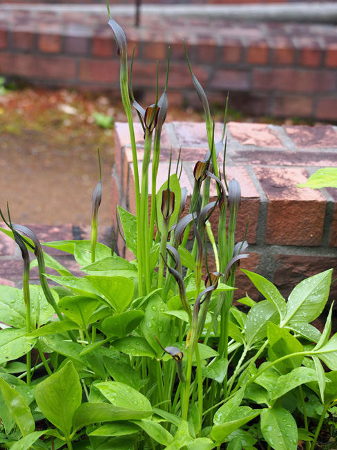 カラスビシャク(烏柄杓)とは、野草並びに薬草の一種である。中国名の半夏でも知られる。 画像出典:東京都薬用植物園にて筆者撮影。 科名:サトイモ科ハンゲ属 学名:Pinellia ternata 原産地:東アジア 生態:多年草 日本や朝鮮半島、中国に分布する多年草である。古くは畑の雑草として知られ、現在も畑や庭などで本種が見られることがあるという。 葉は同じサトイモ科のテンナンショウの類によく似ているがそれより小さく、三出複葉となり、楕円形の葉をつけ、先端がとがる。草丈は20㎝から40cmと短く、目立ちにくい。 初夏から夏の盛りにかけて緑色または帯紫色の仏炎苞に包まれた花を咲かせる。花弁はなく、サトイモ科特有の肉穂花序で、上部が雄花、下部が雌花の役割を果たす。 花序から伸びた糸状の付属体があり、仏炎苞から伸びつように直立し、杓子を思わせるような見た目になる。よく似た草にオオハンゲがあるが、そちらは本種より大ぶりの草姿で、ムカゴをつけないという点で区別する。 球根の皮をむき、石灰をまぶして乾燥させたものは「半夏」の名称で流通し、吐き気の鎮静化や痰切りに効果がある。「へそくり」という言葉は、昔の農村でが、クリにも似た球根を漢方薬として売り歩き、それでひそかに収入を得ていたことに由来する。 変種のシカハンゲ(Pinellia ternata (Thunb.) Breitenb. f. angustata (Schott) Makino)は草姿は本種とよく似ているが、葉が細くなる点で区別する。また、ムラサキハンゲ(Pinellia ternata (Thunb.) Breitenb. f. atropurpurea (Makino) Ohwi)は苞の内側が暗い紫色になる点で区別する。 画像出典:https://jusa.sakura.ne.jp/zukan/karasbisya.html jusa's HOME PAGEより抜粋。「カラスビシャク」名義で記載されていたが、苞の内側が紫色であるため、変種のムラサキハンゲであろうか?