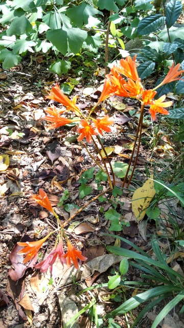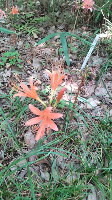 画像出典:牧野記念庭園にて筆者撮影。(左)キツネノカミソリ。(右)オオキツネノカミソリ 科名:ヒガンバナ科ヒガンバナ属 学名:Lycoris sanguinea 原産地 本州~九州、中国 生態:多年草 我が国在来の多年草であるが、中国や朝鮮半島にも生息例がみられ、これは中国や朝鮮半島に球根が何らかの形で持ち込まれたためと推測される。 明るい林床や林縁などに自生するほか、花を観賞用にするため庭に栽培されることもある。早春にヒガンバナ科特有の細い線形の緑色の葉を出す。 8月半ば以降から秋にかけて花茎を30〜50cmほど伸ばし、先端で枝分かれした先に5つほどの花を咲かせる。花は鮮やかな橙色で、6枚の花弁からなる。 ヒガンバナ科の植物の中では花を咲かせる時期が最も早く、また花の色も美しいため観賞用にされることが増えているが、本種は有毒植物としても知られている。全草にリコリンという有毒物質を含むので、摂取すると嘔吐を引き起こし、摂取量が多いほど死亡リスクが高まる。特に、本種の花のつぼみを、ノカンゾウやアキノワスレグサなどのつぼみが食用になる山菜と間違えて食し中毒した例が知られている。 近縁種のオオキツネノカミソリ(var.kiusiana)は植物体全体の特徴は本種によく似ているので紛らわしいが、花が大きく花弁が9cm程になる点と、茎の枝分かれした先に着ける花の数が4個である点、長く突き出したようなおしべを持つ点で区別する。変種名にみられるように、九州地方に多く生息するが、関東地方にも生息例がある。
