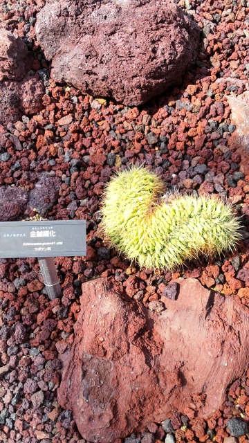 キンシャチ(金鯱)とは、サボテンの一種である。 画像出典: (上)新宿御苑にて筆者撮影 (下)神代植物公園大温室にて撮影。「綴化(てっか)」現象を起こしている株である。「綴化」とは、生長点に何らかの原因で傷が入ったり、突然変異により本来の成長方法とは異なる方法で成長するなどの奇形が発生することをいう。「石化」とも呼ばれるが、これは厳密には奇形現象のうち、特に成長点部分が硬くなったものをいう。 科名:サボテン科エキノカクタス属 学名:Echinocactus grusonii 原産地:メキシコ中部 生態:常緑低木 メキシコの火山岩だらけの切り立った渓谷や高度1400m前後の環境で自生する大型の「球サボテン」と呼ばれる品種である。わが国への正式な渡来時期は不詳ながらも、各地の植物園やサボテン・多肉植物の愛好家により栽培されている。 高さは最大で1m以上に達し、寿命は最長で30年程度である。表面には稜があり、この稜に沿って黄色味を帯びた白色の長く鋭い棘が生える。園芸品種の中には、突然変異を起こして棘が生えなくなったものもある。栽植されてから20年目以降に頂部に小さな黄色い花を咲かせる。 その堂々たる見た目から、「サボテンの王様」の名称で呼ばれる。