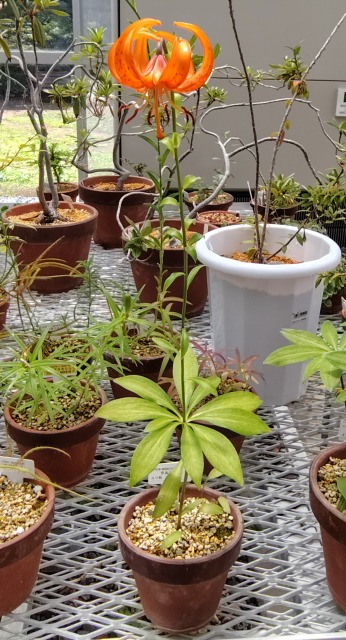 クルマユリ(車百合)とは、山野草の一種である。 画像出典:小石川植物園にて筆者撮影 科名:ユリ科ユリ属 学名:Lilium medeoloides 原産地:日本含む東アジア 生態:多年草 北海道や本州近畿以北、四国、千島列島、&ruby(サハリン){樺太}、朝鮮半島、中国、カムチャッカに分布する多年草で、亜高山帯から高山帯の草地に生息する。 草丈は30cm~70㎝程度になる。茎の中程に、太い披針形の葉を6枚~15枚輪生する。この葉の付き方が車輪の輻(や)(スポーク)に似ていることから、車百合の和名がつけられた。この葉の細いものはチシマクルマユリ(L. medeoloides f. kurilense)という変種である。 7月から8月にかけて、茎の先端に直径5㎝~6㎝程度の鮮やかなオレンジ色の6枚の花被片からなる花を下向きに咲かせる。1株につき1個ないしは複数個の花をつける。花被片は褐色の斑点があり、強く反り返る。花被片がないものはフナシクルマユリ(L. medeoloides A.Gray f. immaculatum Takeda)という変種である。 本種は球根、いわゆる「百合根」が食用となり、アイヌの人々は秋に掘り出した鱗茎を、食べられない芯の部分を除いて鱗片をほぐし、洗ってから米と混ぜて炊いたのち、おたまでつぶして「五平餅」状にしたものを食してきたという。