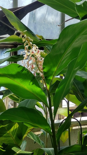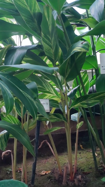 画像出典:(左)東京都薬用植物園にて筆者撮影/(右)東京薬科大学薬用植物園にて筆者撮影。 科名:ショウガ科ハナミョウガ属 学名:Alphinia zerumbet 原産地:熱帯アジア 生態:多年草 熱帯アジアが原産の多年草で、わが国では沖縄県が露地栽培の北限で、それ以外の地域では温室などで栽培される。 草丈は2mから3mほどで、光沢のある葉は長さ40㎝から70㎝、幅5㎝から10㎝の大型の披針形で、先端がややとがる。 6月から8月に茎の先に総状花序を出し、直径2cmほどの白い花を咲かせ、花冠は3つに裂け、中央部は紅サシ状となる。 花の後に、球形の果実をつける。果実はいわゆる蒴果で、当初は黄緑色が、熟すと赤色に変色する。 果実は見た目が面白いので、観賞用としてフラワーアレンジメントの材料にされる。種子は乾燥させ、主に健胃、整腸の効果を持つ薬として使用する。葉は大きいので、古くはお弁当を包むのに利用されたほか、乾燥させて煮出したものは「さんぴん茶」と呼ばれて好んで引用された。「桃」という字から、甘い香りを想像しがちであるが、実際はショウガに似たキレのある香りであるという。 葉に模様の入るものは「キフゲットウ」(黄斑月桃、Alpinia zerumbet 'Variegata')という園芸上の変種で、観賞用にするために栽培する。 画像出典:キフゲットウの写真。東京都薬用植物園にて筆者撮影