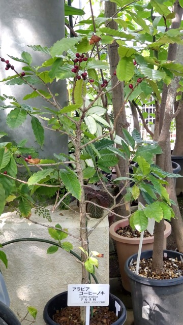 コーヒーノキとは、有用植物の一種である。 画像出典:東京都薬用植物園にて筆者撮影 科名:アカネ科コーヒーノキ属 学名:Coffea arabica L. 原産地:アフリカ 生態:常緑高木 別名:アラビアコーヒーノキ アフリカ大陸の中部や東部、エチオピアなどの原産とされる常緑高木で、現在は世界各地の熱帯地方に広く栽培される。わが国への正式な渡来時期はよくわかっていないものの、明治時代にはコーヒーを飲む習慣が日本にも伝わっており、そのころから植物体ないしは種子が導入されたものと推測される。 樹高は5mないしは8mで、葉は枝に対生し、楕円形で両端がとがり、葉身は7㎝から10㎝である。葉腋に白い花を咲かせ、花の直径は1cmから2cmである。花の下部は筒型で、上部は星形になるように5つに裂ける。花の後には小さな赤い楕円形の果実をつける。熟すとやゝ紫がかった色合いになり、光沢が出る。果実内部には青緑色の種子が2個入っている。この種子がいわゆる「コーヒー豆」で、乾燥させるほか、水につけて発酵させて皮を除いたうえで商品として流通する。粉砕して炒ったのち、煎じて飲料として飲むほか、菓子類の風味づけに用いる。