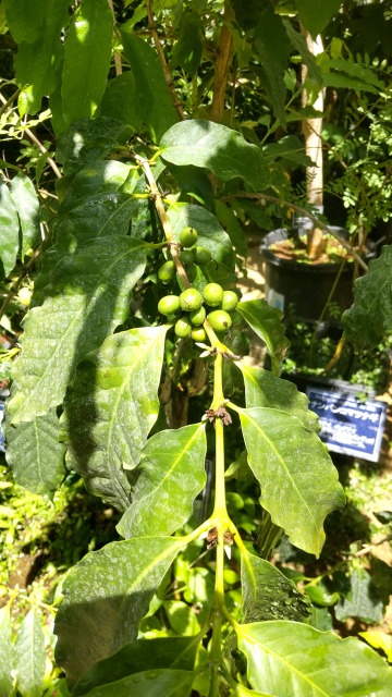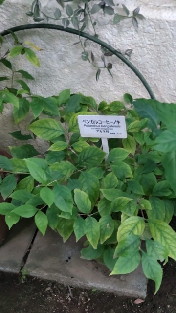 画像出典:東京都薬用植物園にて筆者撮影 名称に「ベンガル」とあるが、実際はタイが原産である。樹高は0.5mから3mで、葉の大きさはアラビアコーヒーと同一だが、片方の先端がとがる卵型になるのが特徴である。 葉の表面は光沢があり、裏には白く短い毛がある。アラビアコーヒーとよく似た白い花を咲かせ、花冠は5つに分かれる。果実は直径6㎜程で、アラビアコーヒーとは異なり黒く熟するのが特徴である。 アラビアコーヒーの種子と比較してやゝ質が劣り、アラビアコーヒーの代用品として用いる。