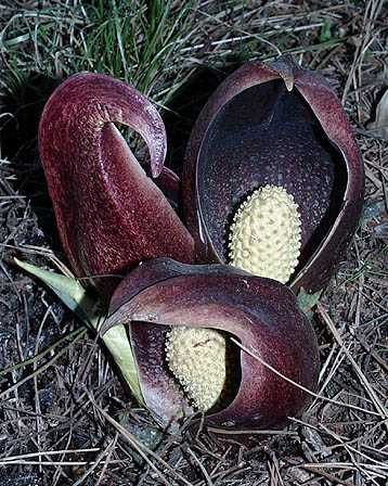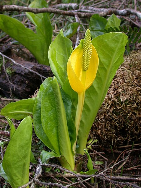 画像出典;https://commons.wikimedia.org/wiki/File:Skunk_Cabbage_in_Bloom-Olympic_(23500097456).jpgU.S. 著作者:Forest Service- Pacific Northwest Region(Public domain) 北米にはアメリカザゼンソウ(S. foetidus (L.) Salisb. ex W.P.C.Barton)という近縁種がある。 湿地帯でよく見られる植物で、花と葉に強烈な臭気があることから「スカンク・キャベッジ」と呼ばれる。これはわが国のザゼンソウとは草姿がよく似ているが、花茎が長くなる点と、仏炎苞が鮮やかなレモンイエローになる点で区別できる。現地では若い葉や根、茎を煮て食べるというが、全草にサポニン・アルカロイドを含んでおり(これはわが国のザゼンソウも同様)、誤食すると嘔吐や下痢、ひどい場合には呼吸困難や心臓麻痺を引き起こす場合があるため、しっかり加熱されてから食用にしてきたという。