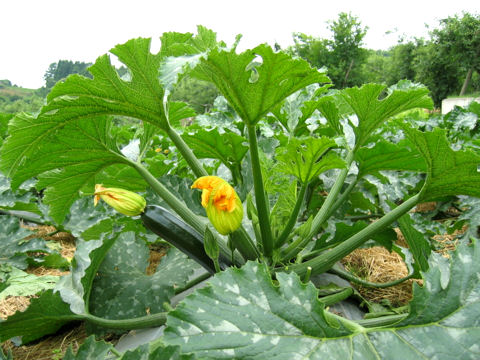 ズッキーニは、西洋野菜の一種である。 画像出典:https://botanic.jp/plants-sa/zucchi.htm 科名:ウリ科カボチャ属 原産地:北アメリカ大陸 学名:Cucurbita pepo var.melopepo 生態:一年草 北アメリカが原産の一年草で、ペポカボチャの一種である。ヨーロッパには植民活動により16世紀ごろにアメリカから持ち込まれ、特に南フランスからイタリアにかけて普及し、その後逆輸入の形でアメリカにも広まった。わが国には昭和時代末期に欧米から輸入され、1980年代初頭にはわが国で栽培されるようになった、比較的ニューフェイスの野菜である。 蔓性の一年草だが、蔓があまり伸びず、親づるの上に果実がつく。葉は大きな掌型で、周囲に鋸歯があり、表面には白い模様が入り、葉柄は長い。この白い模様はよく病気と誤解されるが、これはもともと持っている性質で、ウリ科植物がよく罹患するうどん粉病のそれとは大きく異なり、うどん粉病は表面が白く灰をばらまいたようになる。 近縁種のカボチャのように蔓が四方に伸びることはなく、株全体が横へはう性質をもち、花茎を伸ばして黄色い花を咲かせる。 花を咲かせてから開花後3日から5日後の若い果実を野菜として食用にする。これ以上日にちを置くと、果皮はカチカチに硬くなり、果肉は繊維質が発達して味が悪くなって食用には向かなくなる。果実の形状は前述のようにキュウリ型や丸形、円盤型や洋ナシ形など多彩である。果実の色も、黒緑色や黄色、黄緑色や白色がある。近年は黄色と黄緑色のツートンカラーの品種もある。 若い果実を食用とするため、水分に富む。ナスに似た風味があり、揚げ物や煮物、焼き物に適する。イタリアのカポナータやフランスのラタトウィユなどは有名である。