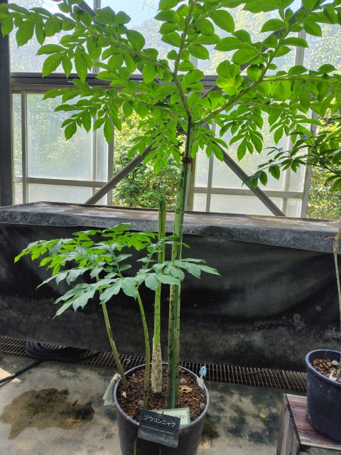 ゾウコンニャク(象蒟蒻)とは、有用植物の一種である。 画像出典:筑波実験植物園にて筆者撮影 科名:サトイモ科コンニャク属 学名:Amorphophallus paeoniifolius 原産地:熱帯アジア 生態:多年草 熱帯アジアが原産の多年草で、わが国では植物園の温室で栽培される。 草丈は1m~2m程度になる。地下に丸みを帯びた形状の塊茎を持ち、その頂部から芽を出して、茎を直立させて成長する。 茎は多肉質な円柱状で、表面には白い斑入り模様を呈する。葉は、茎から長い葉柄を経てつくが、ほかのコンニャク属の植物同様、巨大な羽状となる。小葉は楕円状で、縁には鋸歯があり、先端部は尖る。 4月~6月頃、地下の塊茎から全長1m~2m程度の花茎を立ち上げ、その頂部に仏縁苞をつける。苞の部分は紫色を帯びた褐色で、漏斗状の仏縁苞に包まれた肉穂花序をつけるのが特徴である。開花時期は、ほかのコンニャク類同様、地上部が枯れている頃である。この時「肉が腐ったような」「人糞のような」と例えられるほど激しい悪臭を放つ。わが国でもTV番組「世界一受けたい授業」でゾウコンニャクの生態について解説するために、花を咲かせた植物体がスタジオに持ち込まれたが、あまりの悪臭に使用不能とされたという話があるほどである。 本種は、原産地の東南アジア各国では食用に栽培されている。但し、本種の塊茎にはマンナンを含んでいないため、「こんにゃく」を作ることはできない。また、塊茎にはわが国の「こんにゃく芋」同様にシュウ酸カルシウムを含んでいて生のままでは有毒であるから、蒸かすなど加熱してから食する。また、葉柄も茹でて毒抜きしてから青菜として食用にされる。わが国でサトイモの茎を「ずいき」「といもがら」と呼んで食するのと似たような感覚である。