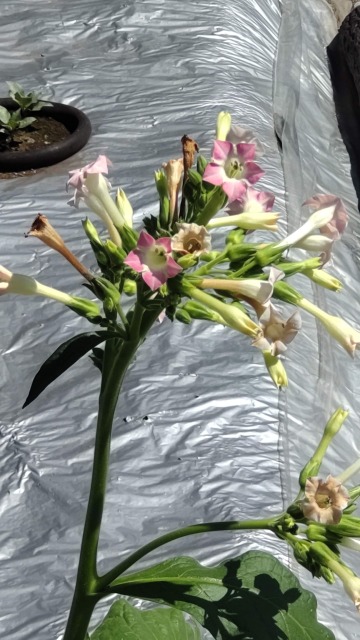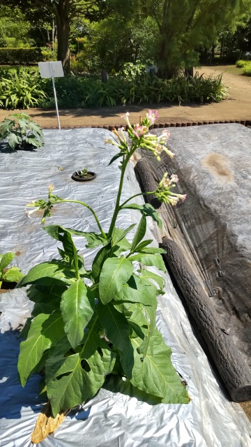 タバコとは、し好品植物の一種である。 画像出典:東京都薬用植物園にて筆者撮影 科名:ナス科タバコ属 学名:Nicotiana tabacum 原産地:南米 生態:多年草 ボリビアやペルーなどの南米の熱帯地域が原産で、わが国には桃山時代に南蛮貿易の折に導入されたという。茎は直立し、草丈は1mから1.5mほどになる。葉は大きな楕円形で長さは30㎝程になり、先端がとがってその表面には綿毛が密生して互生する。夏に、茎の頂点に総状花序をつけ、薄い桃色の五角形の筒状の花を咲かせる。 葉にはニコチンを含み、喫煙のため古くから現地人が本種の葉を乾燥させ、これを利用していた。1518年にスペインの宣教師が現地に訪れた際に本種の種子や乾燥させた植物体を採取し、これを故郷に持ち帰って紹介してからはあまねく利用されるようになった。 しかし、このニコチンは依存性があり、一時的には陶酔をもたらすが、一度味を覚えるとなかなかやめられないという弊害がある。また、発がん性を含むため、健康被害が出ている。これは喫煙者の摂取する主流煙のみならず、喫煙者の周囲の喫煙しない人々にも副流煙が健康に影響を及ぼすことがあるため、現在は公共の場で禁煙となっている箇所が増えている。 本種を免許を習得しないで栽培することは違法となっているので、生きた植物体を見ることが難しくなっている。しかし、本種に近縁で、ピンク色や赤色の星形の花を咲かせるハナタバコ(Nicotiana x sanderae)は民間向けに種子や苗が栽培されている*1ので、観賞用として栽培することができる。ただし、観賞用に流通していて民間に栽培が許可されているものであったとしてもタバコ類の葉からタバコを自作しようとするのは違法なので、絶対に試さないこと!