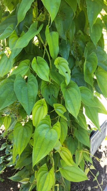ダイジョは、根菜の一種である。 画像出典:東京薬科大学薬用植物園にて撮影/自宅から20分ほどの農産物直売所にて撮影 科名:ヤマノイモ科ヤマノイモ属 学名:Dioscorea alata 原産地:インド、東南アジア 生態:多年草 別名:沖縄ヤマイモ、台湾ヤマイモ、ムラサキイモ、ウベ、コーシャマン 世界中の熱帯地域で広く栽培される。わが国では沖縄県や鹿児島県で栽培される。茎は蔓性で、全長2m~3mに達する。つる状となる点はナガイモやジネンジョと似ているが、翼のような突起を持つ点が異なる。 葉は心臓型で、幅4㎝~13㎝、長さは6㎝~15㎝で、茎に対生する。雌雄異株で、11月から1月にかけて黄緑色の花を咲かせる。通常、1株につき1つの塊茎が付く。また、ムカゴはできない。 塊茎を芋として食用にし、内部の色が赤紫色のものと白色のものがあって、すりおろすとナガイモより強い粘りを持ち、とろろとして食されるのはもちろん、琉球菓子の材料にもされる。 和名は「大薯」、つまり10㎏もの巨大な塊茎に由来する。