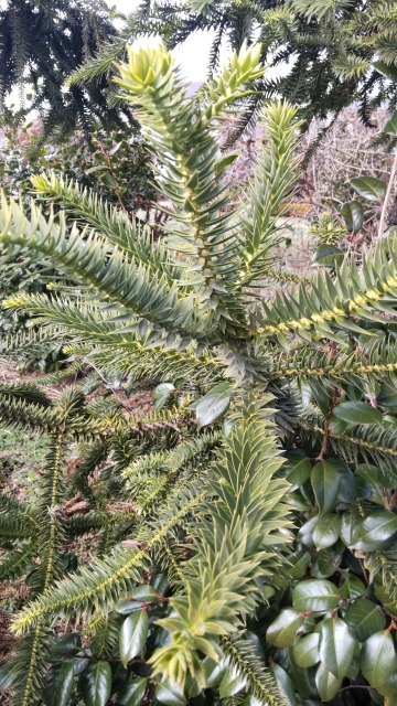 チリマツとは、樹木の一種である。 画像出典:東京都青梅市にて筆者撮影 科名:ナンヨウスギ科ナンヨウスギ属 学名:Arancaria araucana 原産地:南米 生態:常緑高木 別名:アメリカウロコモミ、モンキーパズル チリやアルゼンチンのアンデス山脈に生息し、アンデス山地の南部の斜面に自生品がみられる。樹高は20m~30mになり、また樹幹がキノコのようになって珍しい。これは、下枝を対称形にだすのでこうした珍しい形状になるのである。 葉は長さ3㎝ほどの厚みがある三角形で、先端が鋭くとがり、基部はらせん状となり、密に着く。雄花は20㎝程度の楕円形となり、雌花は直径10㎝の真球形で、枝の先端に花を咲かせ、のちにその部分に球果をつける。 種子は大きく、炒って食用にすることができるという。原産地には猿はいないのだが、その枝や棘の多さから、猿が登るときに難儀する様子を想像させるため、「モンキーパズル」の名称がある。 化石を分析したところ、本種は中生代から地球上に生息していたものとされる。