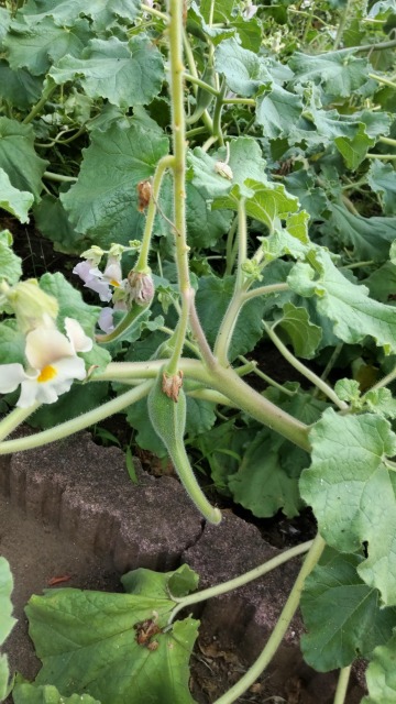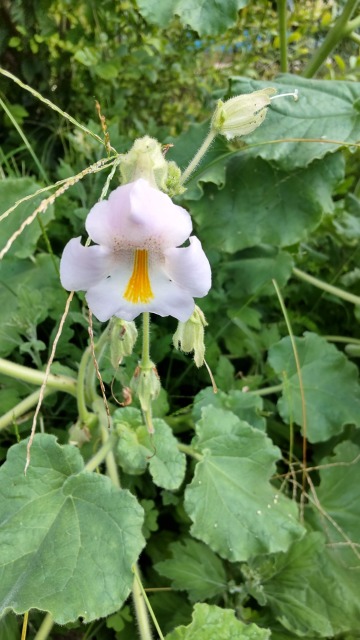 ツノゴマ(角胡麻)とは、食用植物あるいは園芸植物の一種である。 画像出典:東京都薬用植物園にて筆者撮影 科名:ツノゴマ科ツノゴマ属 学名:Proboscidea louisianica 原産地:北米 生態:一年草 北米地域の砂漠地帯が原産の一年草草本植物で、わが国への正式な渡来時期は不明であるが、各地の植物園にて栽培されるほか、熟した果実の乾燥品の形状が面白いので観賞用に販売される。 草丈は50㎝程で、横に広がる習性がある。葉は円形状心形で、粘液質の毛に被われる。花は夏に咲き、唇を思わせるような形状で、先端が5つに分かれる。花弁は白色もしくはクリーム色になり、のどの部分に黄橙色の模様に見えるものがあるが、これは蜜標である。 果実は蒴果で、先端が鋭くとがった勾玉を思わせるような形状である。若い果実はピクルスにされて食用になる。熟した果実は下から裂け、ゴマのような種子をばらまく。種子をばらまき終わった後の果実の莢は先端が鋭い湾曲した2本の棘を持ち、これが地面に落ちているところを偶然通りかかった者がうっかりこれを踏んでしまい、激痛に悶絶することから「旅人泣かせ」「悪魔の爪」と呼ばれる。