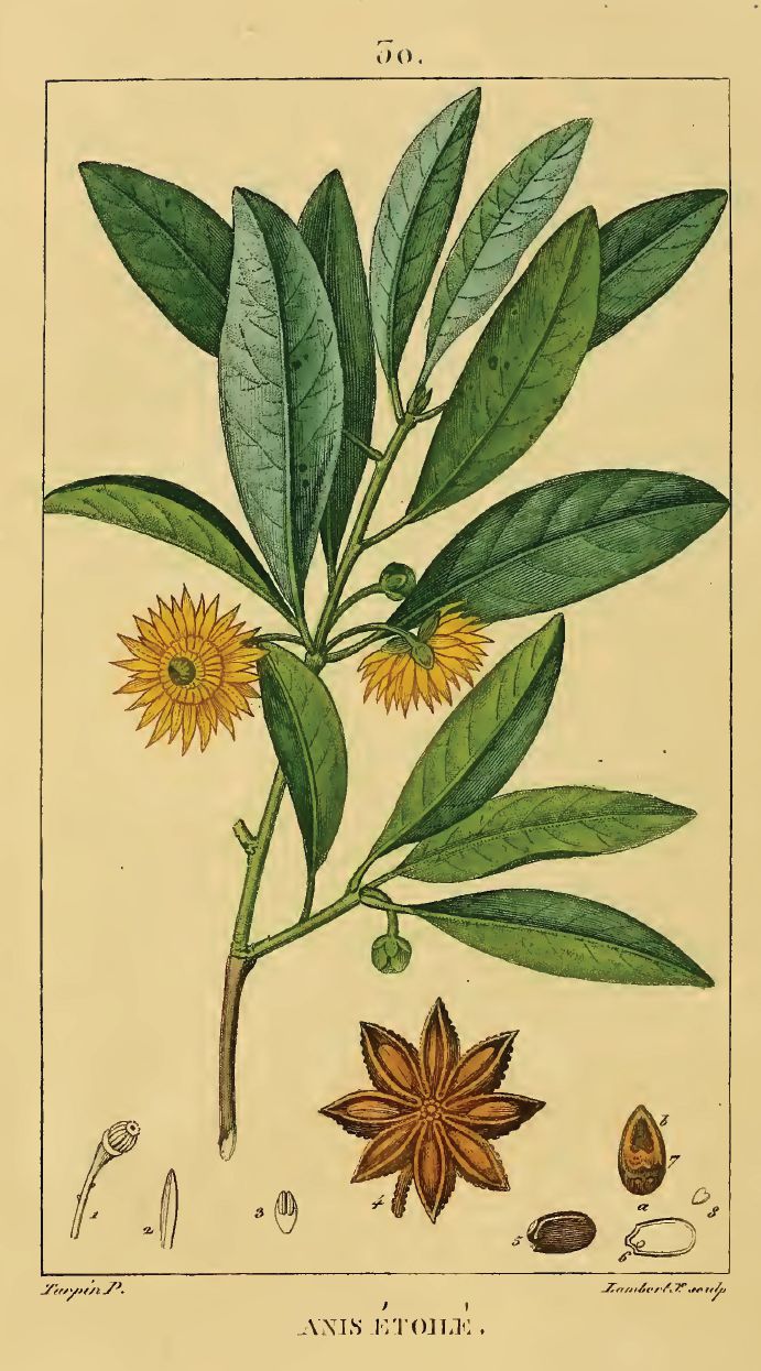 トウシキミ(唐樒)とは、香辛料の一種である。 画像出典:https://ja.wikipedia.org/wiki/%E3%83%88%E3%82%A6%E3%82%B7%E3%82%AD%E3%83%9F 19世紀の植物学者・Pierre Jean François Turpinによるトウシキミの植物画。 科名:マツブサ科シキミ属 学名:Illicium verum 原産地:中国(広西チワン族自治区)~インドシナ 生態:常緑小高木 別名:スターアニス、ダイウイキョウ 中国からインドシナにかけて生育する常緑小高木で、わが国への正式な渡来時期は不明だが、江戸後期の植物図鑑『本草図譜』には西洋の図譜から転写された本種の図が収録されている。 樹高は10m前後で、葉は2cmほどの先端がとがる披針形となり、枝に互生する。春と秋の二回、葉腋から花茎を出し、芳香のある赤い花を下向きに咲かせる。花の後には袋果が星形に集まった集合果で、それぞれの袋果がやや上向きに曲がる。熟すと褐色に変色し、種子を露出して特有の芳香を放つ。 本種の果実は「八角」という名称で流通し、豚の角煮などの中華料理やマッサマンカレーなどのタイ料理用の香辛料として用いられる。香辛料以外にも、健医薬やインフルエンザの治療薬・タミフルの合成原料にも用いられる。本種の果実は有毒植物のシキミのそれとよく似ているので、中毒事故が起こりやすい。以下に、本種とシキミの果実の相違を記載する。