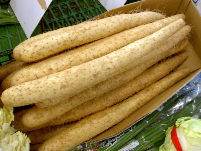 ナガイモは、根菜の一種である。 画像出典:https://botanic.jp/plants-na/nagaim.htm 画像出典:https://ja.wikipedia.org/wiki/%E3%83%8A%E3%82%AC%E3%82%A4%E3%83%A2 科名:ヤマノイモ科ヤマノイモ属 学名: Dioscorea batatas 原産地:中国 生態:蔓性多年草 中国が原産であるとされ、わが国には江戸時代以前に渡来しており、江戸時代初期の百科事典「大和本草」にはすでに名が出ている。 ヤマノイモとは異なり、普通は畑で栽培されるが、繁殖力が強いためか、現在は山野に生息していることもあるらしい。 雌雄異株で、葉は長心臓形で葉柄が長く、対生あるいは3輪生する。夏に葉腋に穂状花序をつけ、小さな白い花を咲かせたのち、秋ごろに蒴果をつけ、蒴果が割れて種子が飛び出すのだが、この種子は周囲に翼のようなものがあるグライダー状になっている。この種子は容易に風に乗って飛ぶため、風に乗って山野の土壌に落下し、そこで根付いて芽吹き、生息するのであろう。 根茎は先端にかけてやや太くなる円柱形で、ヤマノイモと比較してあまり粘性がない。すりおろしてとろろにしたのち、麦飯やそば、うどんにかけて食すほか、練り物のつなぎにする。秋から冬に葉腋に小さな黒褐色のムカゴをつけ、このムカゴも食用にすることができ、甘露煮や炊き込みご飯にされる。このムカゴを土中に埋め、成長させて種イモにしてから栽培することもできる。