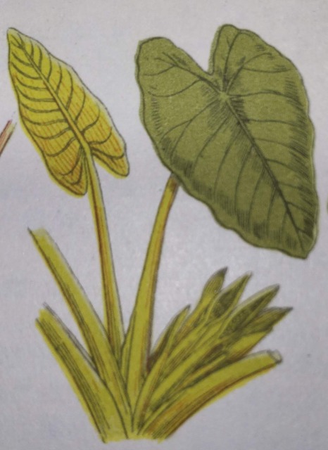 ハスイモとは、野菜の一種である。 画像出典:筆者の蔵書「原色図説植物大辞典」(1938年)より抜粋。 科名:サトイモ科サトイモ属 学名:Colocasia gigantea 原産地:東南アジア 生態:多年草 別名:リュウキュウ、アオズイキ 東南アジアが原産の常緑性多年草で、わが国の渡来時期は未詳だが、江戸時代にはすでに栽培されていたものと思われる。 葉は長さ1m~1.3mで、葉の形状は卵型で、30㎝~50㎝の長い黄緑色の柄を持ち、葉脈は蓮の葉のように隆起する。 葉の間に30㎝ほどの花茎を出し、白い仏炎苞に包まれた黄色い棒状の花を咲かせる。 本種のイモは硬くて小さく、味も不味いので食用にならない。長い葉柄を漬物や煮物にして食用にする。土佐では「りゅうきゅう」の名称で「田舎寿司」という寿司類の具材にしてきた。 本種は厳密に言うとサトイモとは同属の別種だが、しばしばサトイモの一品種として扱われる。