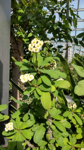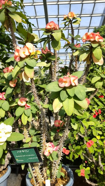 ハナキリンとは、観賞用の植物の一種である。 画像出典:いずれも板橋区立熱帯植物環境館にて撮影 科名:トウダイグサ科トウダイグサ属 学名:Euphorbia milii var. splendens 原産地:マダガスカル 生態:常緑低木 マダガスカル島が原産の常緑低木で、わが国には幕末~明治初期に渡来し、現在は観賞用として植物園の温室や庭園に植えられている。 茎は多肉質でトゲが密集し、当初は直立するが、成長するにつれて半蔓性となり、ほかのものに絡みついて成長する。長さ3cmほどの葉は楕円形で、茎の先端につき、これが成長するとトゲ状になる。 茎の先端に直径1㎝~2㎝程の花を観賞し、花色は赤色やピンク色、白色などがあり多彩。ここで「花」と解説した部分は正確には「苞」と呼ばれる部分であり、本来の花は苞に包まれており、黄色で小さく、目立たない。この色づいた花弁にも見える「苞」を観賞用とする。 茎を折ると出てくる樹液は有毒で、皮膚炎などの症状を引き起こすことがあり、また幹には鋭いとげがあるので、手入れの際には必ずゴム手袋をするべきである。