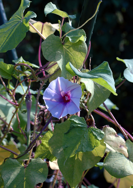 ハリアサガオは、園芸植物ならびに帰化植物の一種である。 画像出典:花の画像はhttp://jusa.sakura.ne.jp/zukan/hariasagao.html、果実の画像は自宅近くのスーパーマーケットの路地裏で筆者撮影 科名:ヒルガオ科ヨルガオ属 学名:Calonyction muricatum 原産地:熱帯アメリカ 生態:蔓性一年草 別名:トゲヨルガオ、アカバナユウガオ 熱帯アメリカが原産のつる性一年草で、わが国には江戸時代に渡来し、「和漢三才図会」に記載されている。現在は路地裏などに野生することもある。ヨルガオとは近縁だが、ヨルガオより渡来時期は早い。 茎は蔓となってよく分岐し、長さは1m以上になる。葉は長い柄を持って互生し、ハート形で全縁、長さは10㎝~13㎝である。茎や葉柄には太い針状のトゲがあるが、先端が丸く、且つ柔らかいため触っても痛くない。夏から秋にかけて、葉腋から出る花柄の先に直径5㎝ほどの薄紫色の花を咲かせる。花はじょうご型で中心部は紫色で、夜から早朝にかけて花を咲かせる。花の後、蕚片の果柄の部分が先の方に向かって円錐形となり、果実が下向きに実り、小型のナスのような見た目になる。 果実は古くは「天香茄」や「チョウジナスビ(丁子茄子)」の名称で、野菜(ナスの一種)として食用にされたことがある。