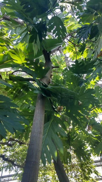 パンノキとは、熱帯果樹の一種である。 画像出典:夢の島熱帯植物館にて撮影 科名:クワ科パンノキ属 学名:Artocarpus communis Forst. 原産地:ポリネシア 生態:常緑高木 太平洋諸島のポリネシアを原産地とする、10m~20mに達する常緑高木である。葉は大きく、掌状に7~9裂 花は単性花でそれぞれ花序を形成し、雌雄同株である。果実の直径は直径15㎝~25㎝で、果肉にはでんぷんを含み、焼いて食す。 フィジーやサモアなどでは主食とされるため、入植者によりBreadfruitの名称がつけられたが、風味はパンというよりも、サツマイモに近いという。 栽培品の多くはタネ無しだが、種子のある品種も存在する。この場合は種子が焼いて食され、クリに似た風味であるという。現在はポリネシアだけでなく東南アジアや各地の植物園で栽培される。