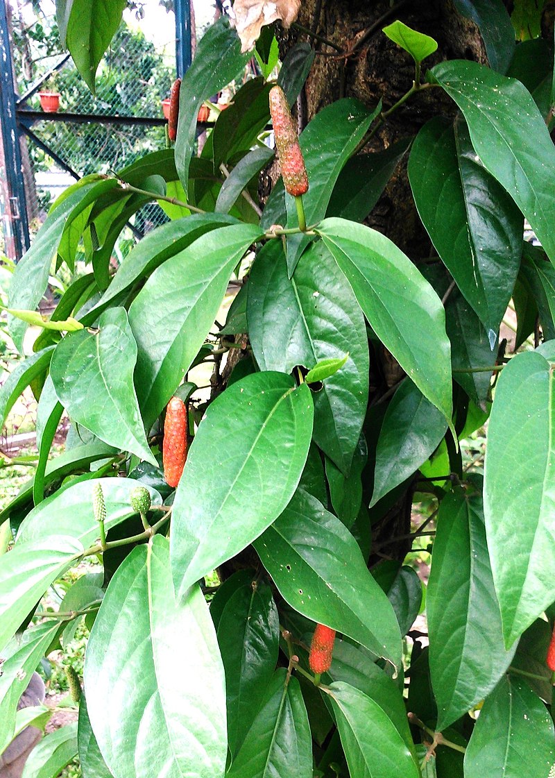 ヒハツモドキとは、香辛料の一種である。 画像出典:https://ja.wikipedia.org/wiki/%E3%83%92%E3%83%8F%E3%83%84%E3%83%A2%E3%83%89%E3%82%AD 著作者:Kembangraps(CC0) 科名:コショウ科コショウ属 学名:Piper retrofractum 原産地:未特定 生態:つる性木本 中国南部、インドシナ半島、フィリピン、マレー半島、インドネシアなどで栽培されているが、原産地は特定されていないという。単に「ヒハツ」と呼ばれることもあるが、植物学上はこちらは同属のP.longumの和名として用いられる。 茎は蔓となり、褐色で直径2mmほどと細く、全体の長さは4mから5mほどになる。葉は長楕円形で先端がとがり、茎に互生して、基部はしばしば左右非対称、葉縁は全縁となる。 雌雄異株で、5月から7月に葉に対生ように花穂を出して上向きに花を咲かせる。果実は核果が円筒形状に集合したもので、当初は緑色だが、熟すと赤みがかった橙色に変色する。 果実(特に未熟な果実)や新芽を、琉球諸島(特に八重山諸島)や鹿児島県南部(与那国島)、中国南部、インドシナ半島、フィリピン、マレー半島、インドネシアで香辛料として利用する。これらの部位にははカプサイシンやピペリンが含まれているので、辛味がある。未熟な果実を乾燥させて炒り、粉に挽いたものをコショウのように用いるのである。たとえば、八重山そば*1にちょっとした風味付けをするために加える。ラーメンにコショウを少し振りかけるのと同じ感覚である。また、ステーキを焼く前にコショウ代わりに用いることもある。わが国では「島コショウ」や八重山諸島での現地名「ピパーチ」で知られており、乾燥した果実を粉に挽いたものが流通する。 薬草としても知られ、強壮、食欲増進、健胃整腸のほか、消化不良・関節痛・腰痛・咳などの改善に用いる。