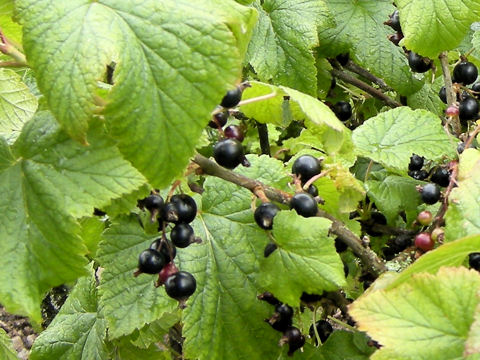 画像出典:https://botanic.jp/plants-ka/kurosu.htm 「ボタニックガーデン」の「くろすぐり」のページから。 ヨーロッパの中・北部からアジア北部に分布する落葉小低木で、わが国には明治初年にアメリカから導入されてはいるものの、現在はフサスグリほど経済的な栽培は多くはない。「カシス」の名称でも知られる。 樹高は1mから1.5mほどになり、枝条に特有の臭気がある。葉は掌状に5裂し、枝に互生する。5月に総状花序を出して、5個から10個の花を咲かせる。7月から8月に、一房に10個ほどの小さな果実をつけ、黒みの強い黒紫色に熟す。 果実はフサスグリと比較して酸味が強く、生食には向かないのでゼリーや菓子、ジュースや果実酒に加工して食する。