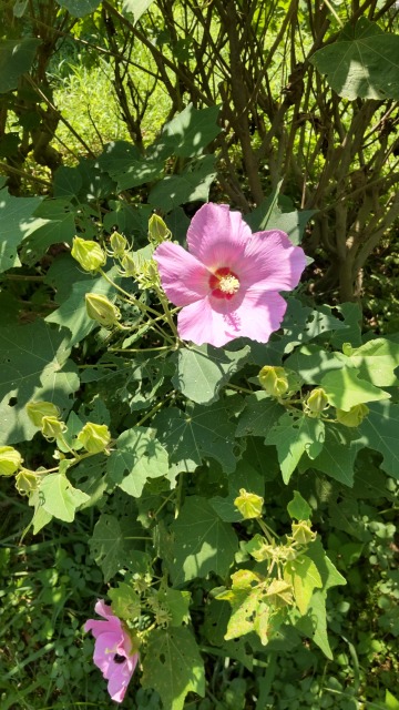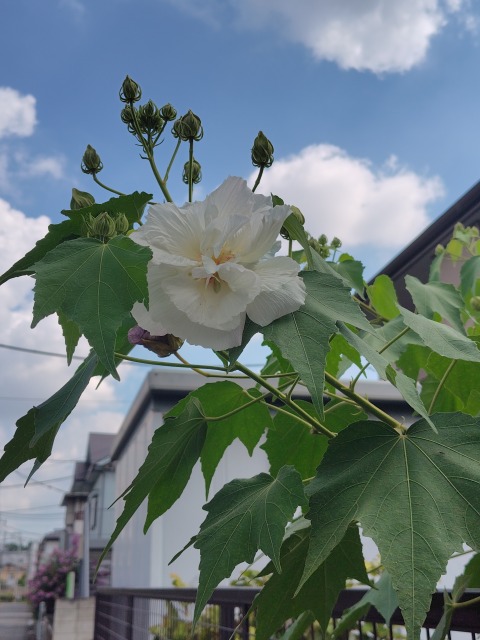 フヨウ(芙蓉)とは、花木の一種である。 画像出典:夢の島熱帯植物環境館にて筆者撮影 科名:アオイ科フヨウ属 学名:Hibiscus mutabilis L. 原産地:中国 生態:落葉低木 中国が原産の落葉低木で、我が国には古い時代に渡来して園芸植物として栽培されてきたが、温暖な地域では野生化している例も知られている。わが国のような温帯地域では冬には落葉して、熱帯・亜熱帯地域においては常緑である。 樹高は1.5m~3mほどとなり、葉や幹に至るまで白い星状毛が密生している。幹は白色を帯びる褐色ですべすべしており、叢生する。若枝は緑色、星状毛と腺毛がある。 葉は長い柄があって互生し、長さ10~20㎝の五角状卵円形、掌状に浅く3~7裂し、裂片の先が尖り、基部はハート形となる。 夏から秋にかけて、枝先に花を咲かせる。花は直径10㎝から14㎝程である。花の咲き方は一重咲きと八重咲のものがあり、一重咲きのものは5枚の花弁からなり、花弁の色は白色~紅紫色である。朝に開き、夕方にはしぼむ「一日花」の一つである。