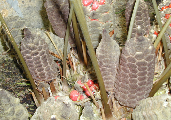 フロリダソテツとは、樹木の一種である。 画像出典:(上)https://commons.wikimedia.org/wiki/File:Miami_Beach_Botanical_Garden_-_IMG_8037.JPG/(下)https://commons.wikimedia.org/wiki/File:Zamia_pumila.jpg 科名:ザミア科ザミア属 学名:Zamia pumila(Z.integrifoliaの学名で呼ばれることもある) 原産地:北米 生態:常緑小低木 別名:ホソバザミア アメリカ合衆国のフロリダ州および西インド諸島、メキシコに分布する常緑小低木である。地表に現れる部分は15㎝ほどの高さで、殆どが地下に潜る。 ソテツ科の樹木にまゝ見られるように、小葉が2~13対ついた大きな羽状複葉を持つ。ソテツ科らしく雄花と雌花の形状が異なり、雄花は円筒状で、雌花は鱗片に覆われた長い円柱形である。 地下の根には良質なでんぷんが含まれ、製粉したのち「フロリダ・アロールート」の名称で利用されるが、サイカシンという有毒成分を含んでいるため、1週間ほど水につけて毒素を抜いてから利用する。