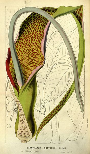 ヘビイモとは、熱帯植物の一種である。 画像出典:https://commons.wikimedia.org/wiki/File:Flore_des_serres_v13_079a.jpg「カーティス・ボタニカル・マガジン」に記載されたSauromatum venosumの植物画。 科名:サトイモ科サウロマタム属 学名:Sauromatum venosum 原産地:インド 生態:多年草 インドやネパールの標高200m前後の場所に生え、わが国への渡来時期は不詳であるが、現在は各地の植物園の温室で栽培し観賞用にする。 草丈は80㎝から90㎝で、地下の塊茎は直径15㎝で、ごつごつとした偏球形である。一見するとコンニャクイモを思わせるような形状であるが、有毒成分を含んでおり、いかなる処理をしても有毒成分を完全に抜き去ることは難しいので、食用にはしない。 葉はコンニャクのそれに似た羽状複葉で、直径50㎝、長さ80㎝である。 葉柄には蛇を思わせるような褐色の斑点があり、和名の「ヘビイモ」はこれに由来する。葉を出すより先に緑色の花を咲かせる。花の下部は黄色くなり、内部には赤褐色の斑点がある。 花には特有の悪臭があるが、これはハエなどに受粉の仲立ちをしてもらうためである。40㎝程のひょろ長い仏炎苞を持ち、開花中は先端が下向きに垂れさがって地面につく。肉穂花序の付属物は黒みがかった紫色で、仏炎苞より短い。