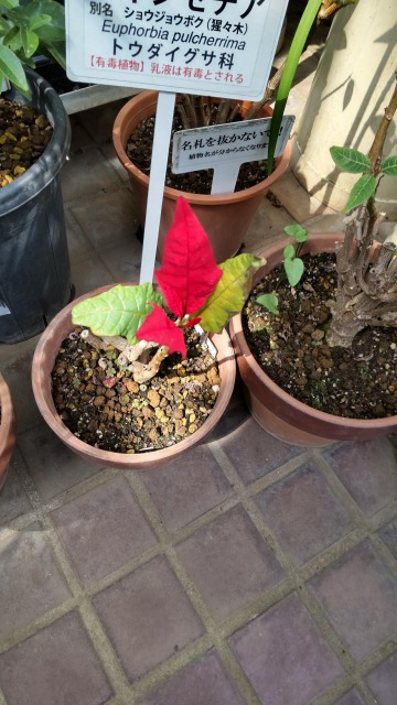 ポインセチアは、観賞用に栽培される園芸植物の一種である。ポインセチアは通称で、植物学上はショウジョウボクの名称で呼ばれる。 画像出典:上は東京都薬用植物園にて撮影。下は福岡市植物園にて撮影 科名:トウダイグサ科トウダイグサ属 学名:Euphorbia pulcherrima 原産地:メキシコ 生態:常緑低木 クリスマスを彩る植物として有名な園芸植物で、わが国には明治時代に渡来し、観賞用に栽培されてきた。 11月から12月にかけて苞葉が赤色に色づき、下部の葉の緑色との対比が美しい。鉢植えとして流通し、その場合の樹高は最大でも30㎝ほどである。これと同じ時期に花も咲かせるのだが、花弁がなく、また小さいので目立たない。現在は苞葉が赤色だけでなく、ピンク色や黄色になる園芸品種もある。 現地では2m~3mの低木に成長する。写真2枚目は温室内の気温を調節し、現地の環境に似せて育てたものである。 肌の弱い人は樹液にふれるとかぶれることがあるので、ゴム手袋をして手入れをすることをおすすめする。